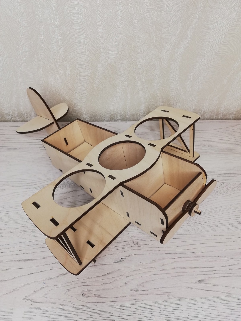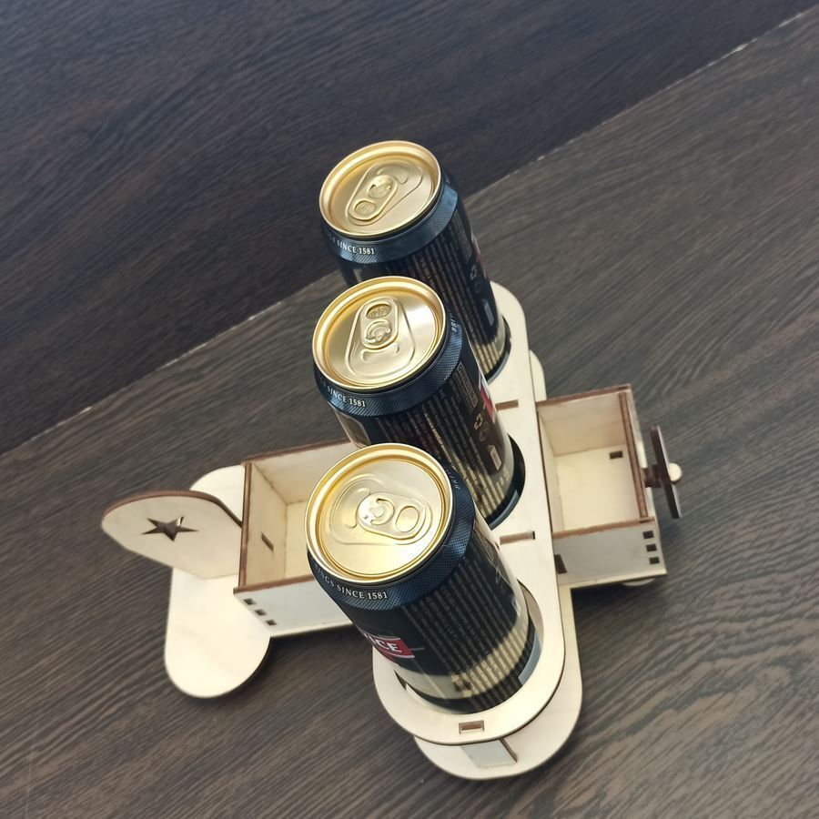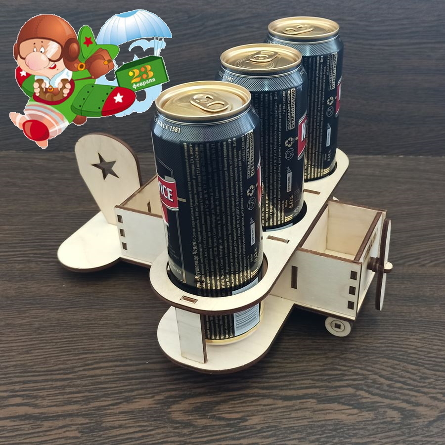 Сборная модель самолета. Модель самолета также порадует любителей естественной структуры дерева и эко стиля в интерьере. Деревянный самолет это интересный и креативный подарок на 23 февраля. В корпусе самолета расположен отсек для 3-х банок пенного, в хвостовую и переднюю часть можно положить еще один презент орешки или снеки. • Размер: 28 х 25 х 10 см, толщина стенок 4 мм.