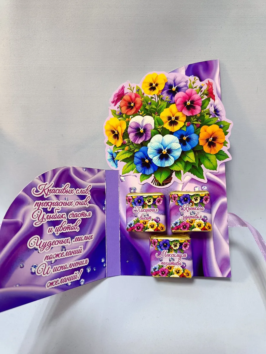 Сладкая открытка с тремя конфетами - это прекрасный способ поздравить любимую бабушку, дочь или женщину с днем рождения. Объемная открытка с аппликацией и сюрпризом в виде вкусных конфет точно поднимет настроение и добавит нотку сладости в этот особенный день. Оригинальный дизайн и приятный шоколадный вкус сделают этот подарок незабываемым. Порадуйте своих близких чем-то особенным!