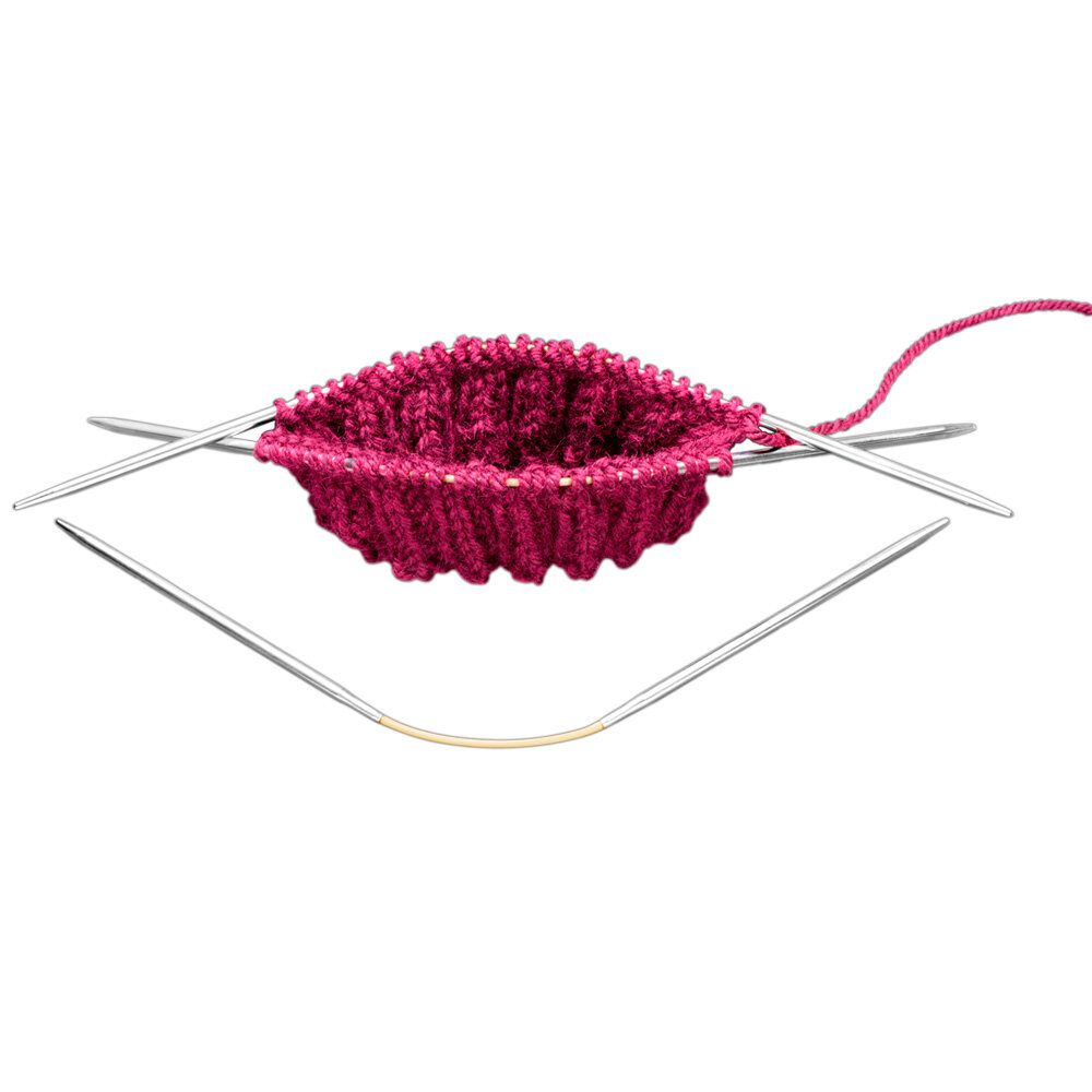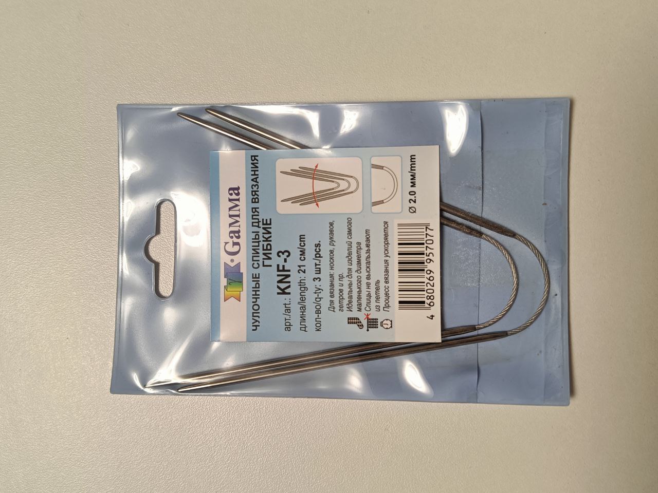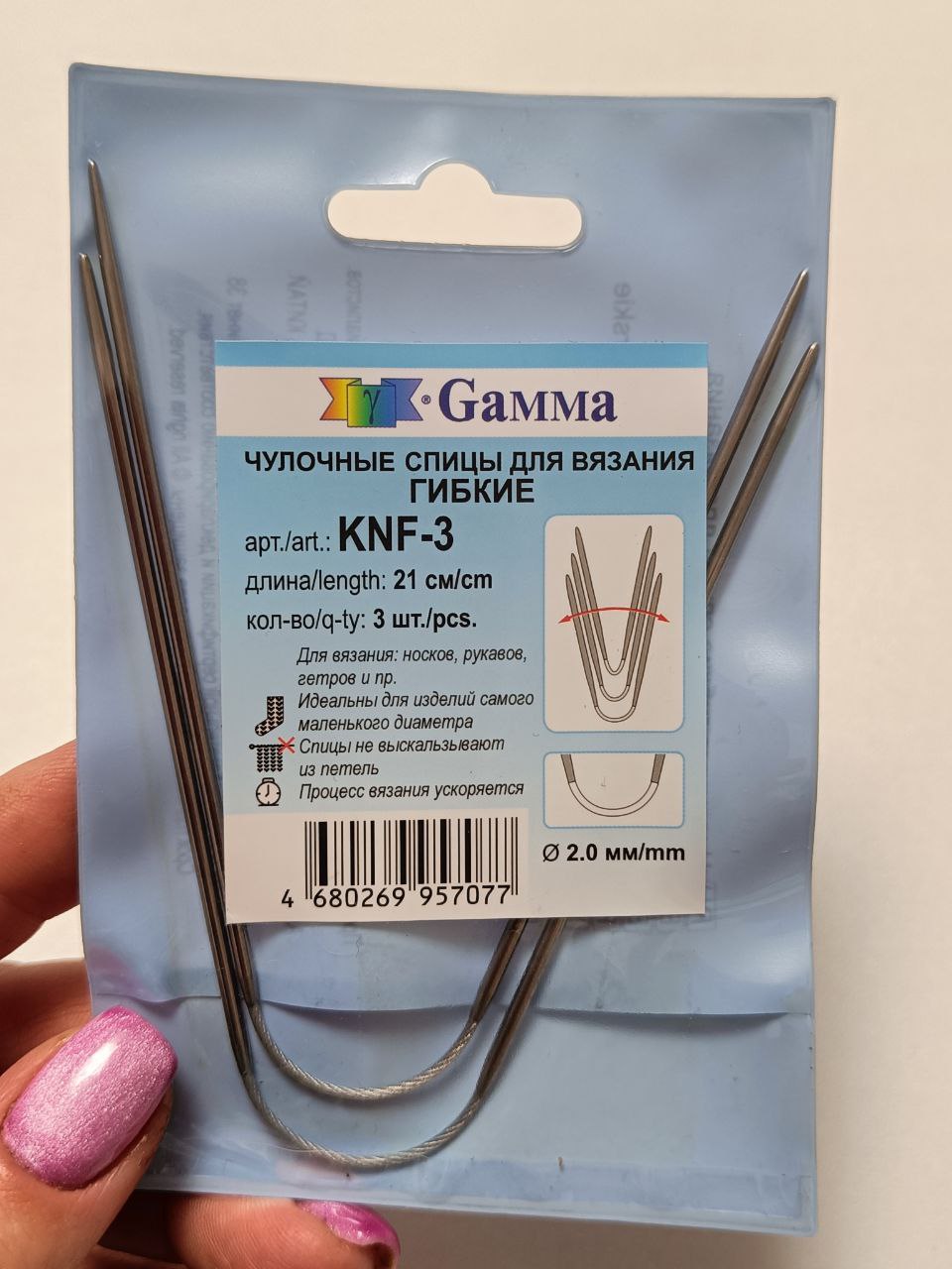 Спицы гибкие чулочные - предназначены для вязания изделий по кругу небольшого размера: носки, варежки, гольфы. За счет гибкой формы, спицы удобно держать в руке. Процесс вязания ускоряется из-за меньшего количества переходов, вместо привычных четырех, делается всего два перехода.